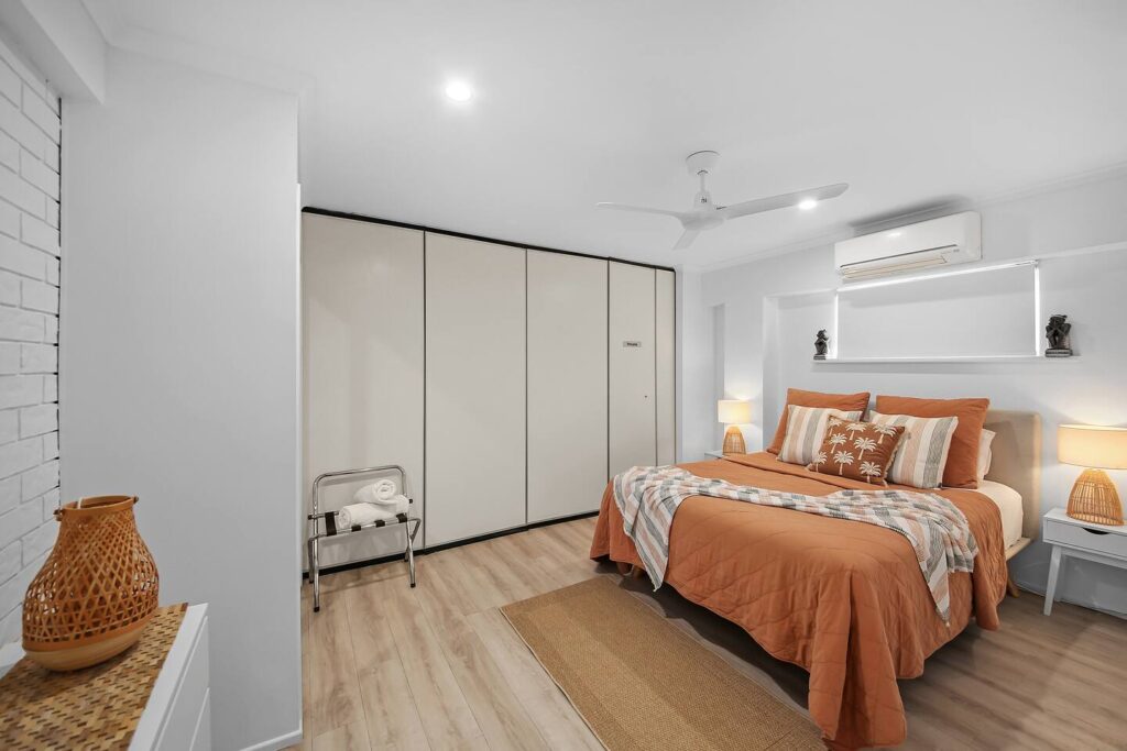 This ground level 1 bedroom apartment is walking distance from dining precinct, shopping, entertainment & swimming waterways . The unit has private access via a gated side pathway, leading to the grassed backyard and entrance door. Located in a quiet street, offering an easy care relaxed stay with modern, clean finishes and the comforts that will keep you feeling satisfied your entire stay. Enjoy the air conditioned Queen sized Bedroom with hotel quality bedding & crisp white linen. The living space provides comfort & functionality.
